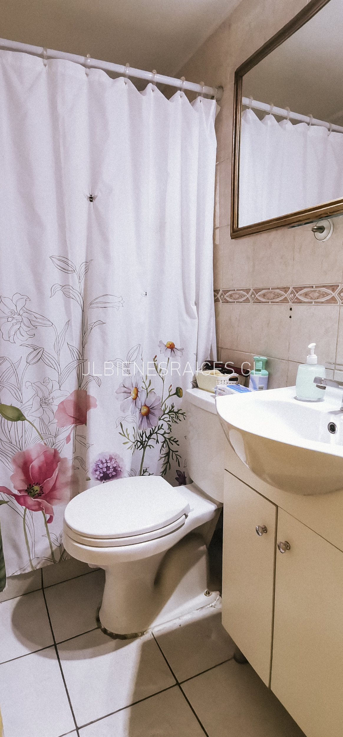 Baño: Piso y pardes en revestimiento en cerámico, ventanilla con marco de fierro, WC, lavamanos vanistorio, ducha con tina, espejo y lámpara.